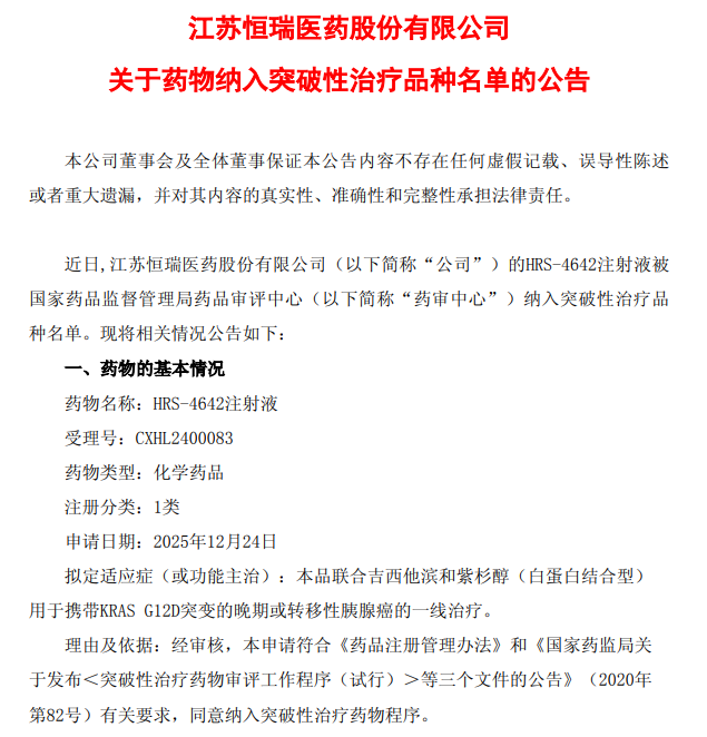 2月6日,恒瑞医药(600276.SH)发布公告称,近日公司的HRS-4642注射液被国家药品监督管理局药品审评中心纳入突破性治疗品种名单。拟定适应症为联合吉西他滨和紫杉醇(白蛋白结合型)用于携带KRAS G12D突变的晚期或转移性胰腺癌的一线治疗。