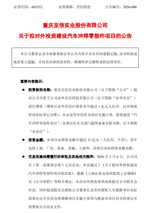 2月6日,至信股份(603352.SH)公告称,公司拟对全资子公司金华至信进行增资,并由金华至信作为项目实施主体,投资建设“汽车冲焊零部件项目”,总投资金额不超过11亿元。项目将购置各类先进设备,新增生产线和工作站,形成汽车零部件和汽车座椅骨架的生产能力。项目建设期36个月,预计开工时间为2026年7月1日。