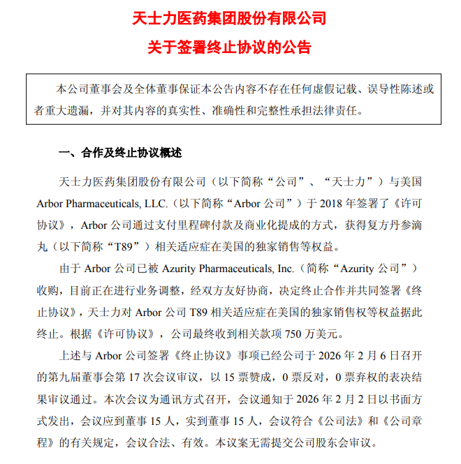 2月6日,天士力(600535.SH)发布公告,内容中提到,公司与美国Arbor 公司于2018 年签署了《许可协议》,Arbor 公司通过支付里程碑付款及商业化提成的方式,获得复方丹参滴丸(以下简称“T89”)相关适应症在美国的独家销售等权益。由于 Arbor 公司已被Azurity公司收购,目前正在进行业务调整,经双方友好协商,决定终止合作并共同签署《终止协议》,天士力对 Arbor 公司 T89 相关适应症在美国的独家销售权等权益据此终止。根据《许可协议》,公司最终收到相关款项 750 万美元。