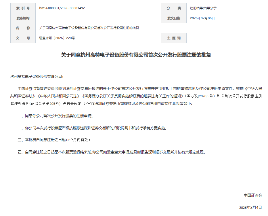 证监会同意高特电子创业板IPO注册申请 财闻 2026-02-06 17:54:15 批复自同意注册之日起12个月内有效。 2月6日,证监会同意杭州高特电子设备股份有限公司首次公开发行股票并在创业板上市的注册申请,本批复自同意注册之日起12个月内有效。