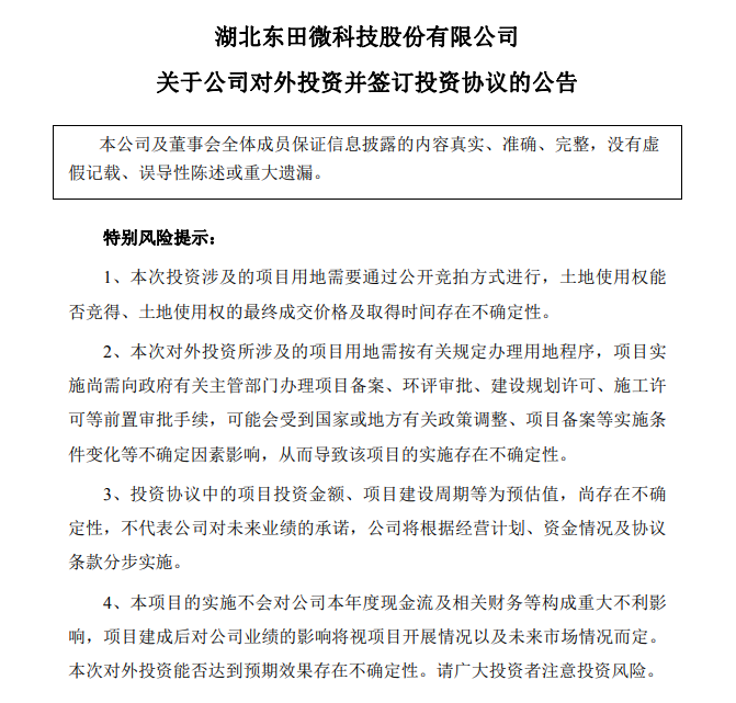 2月6日,东田微(301183.SZ)发布公告称,内容中提到,公司为完善公司产业布局,满足客户就近配套需求,促进公司的中长期战略规划落地,拟与广东省东莞市道滘镇人民政府签订《项目投资协议》,计划在东莞市道滘镇昌平村投资建设“东田微全球研发中心及华南制造总部项目”,项目投资总额为4亿元(含土地价款,最终以实际投资金额为准),该项目计划由公司全资子公司广东东田微智能技术有限公司负责实施建设。