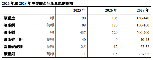 另外,在公司“2026年和2028年主要矿产品产量规划指标”中表示,2026年预计矿产金为105吨、矿产铜为120万吨、矿产银为520吨。
