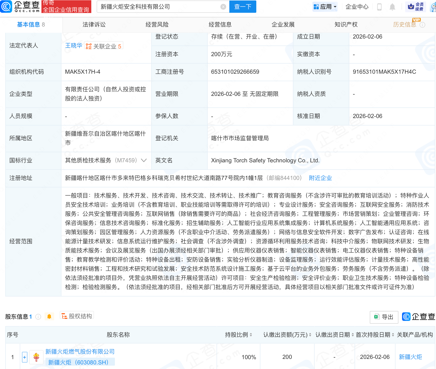 企查查APP显示,近日,新疆火炬安全科技有限公司成立,经营范围包含:人工智能行业应用系统集成服务;计算机系统服务;人工智能通用应用系统;咨询策划服务;园区管理服务等。企查查股权穿透显示,该公司由新疆火炬(603080.SH)全资持股。