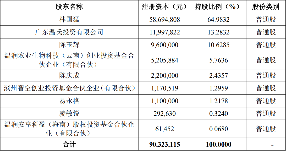 最终,恒鑫生物注册资本将增至9032.31万元,同时林国猛持股占比也降至64.98%,而温氏投资、温润农业、温润安享则分别持有13.28%、5.76%、0.07%的股权,新进其第二、第四、第九大股东。