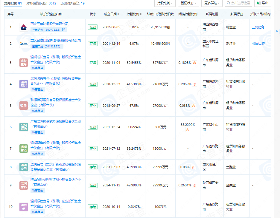 目前,温氏投资已发起、设立、参投超37支基金,总规模超129.82亿元。另持有三角防务、登康口腔、美利信等10家上市公司部分股权。