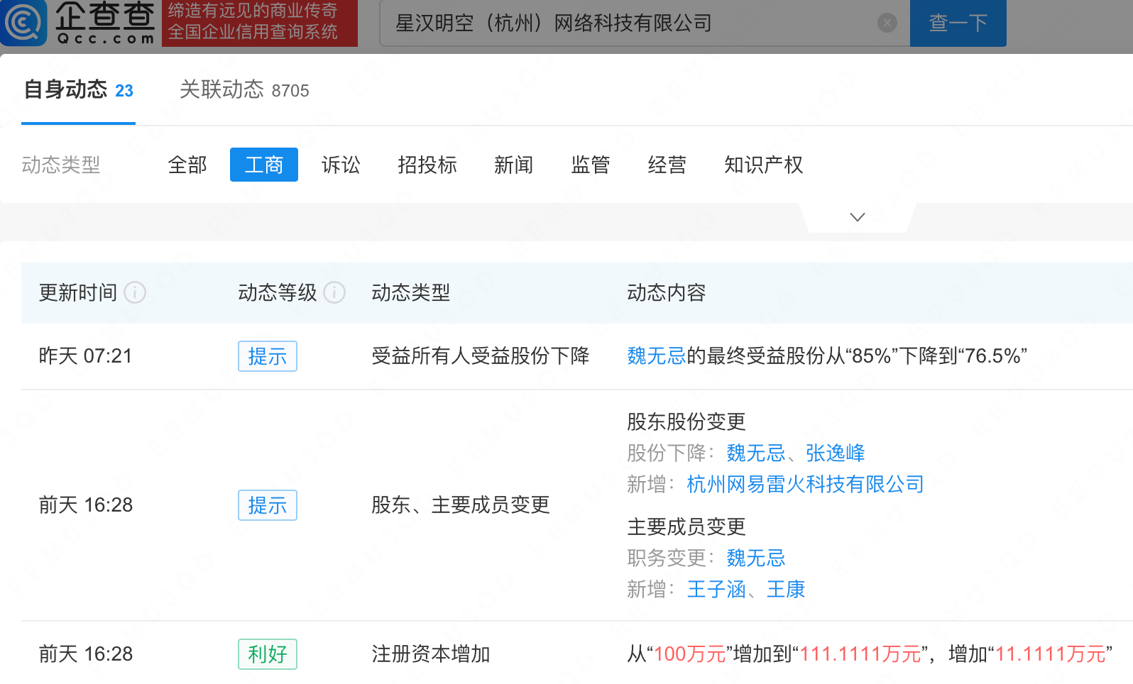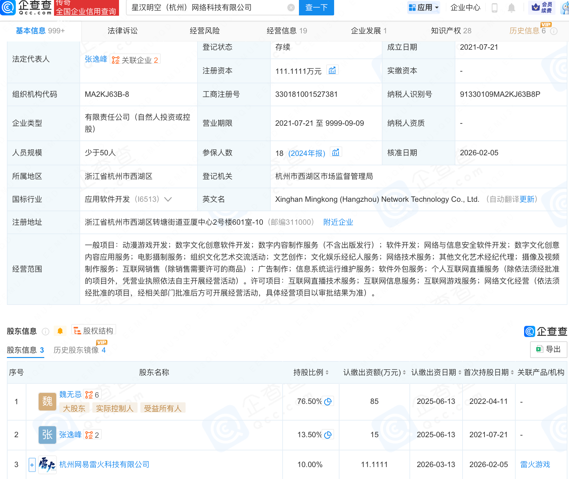 企查查APP显示,近日,星汉明空(杭州)网络科技有限公司发生工商变更,新增杭州网易雷火科技有限公司为股东,同时注册资本增至111.11万元。企查查信息显示,该公司成立于2021年,法定代表人为张逸峰,经营范围包含:动漫游戏开发;数字文化创意软件开发;数字内容制作服务(不含出版发行);软件开发等。