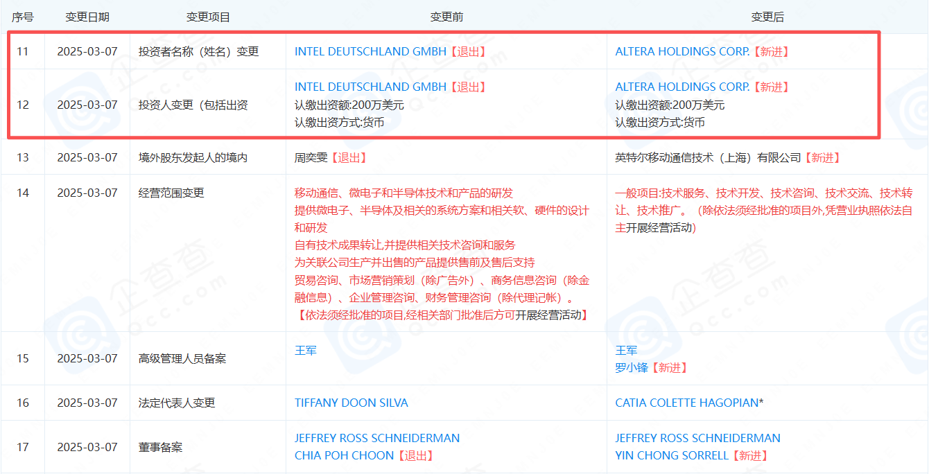 工商变更信息显示,2025年3月,原股东INTEL DEUTSCHLAND GMBH退出,新增ALTERA HOLDINGS CORP.为全资股东。