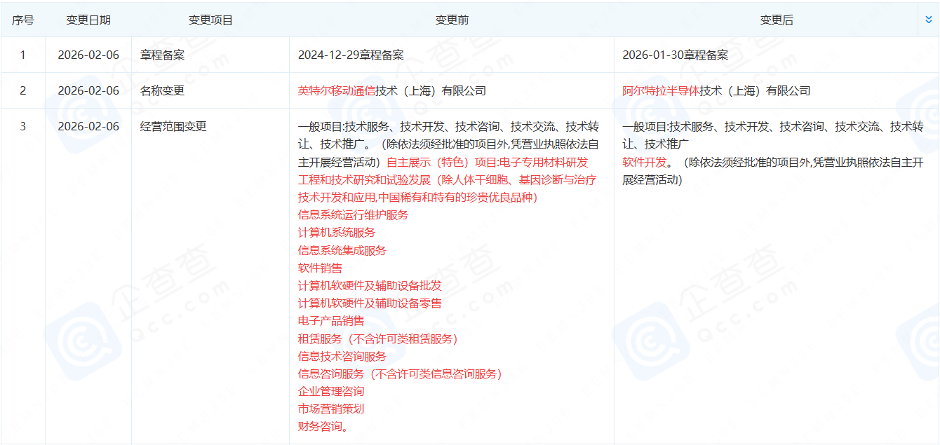 据企查查,2月6日,英特尔移动通信技术(上海)有限公司发生工商变更,企业名称变更为阿尔特拉半导体技术(上海)有限公司。