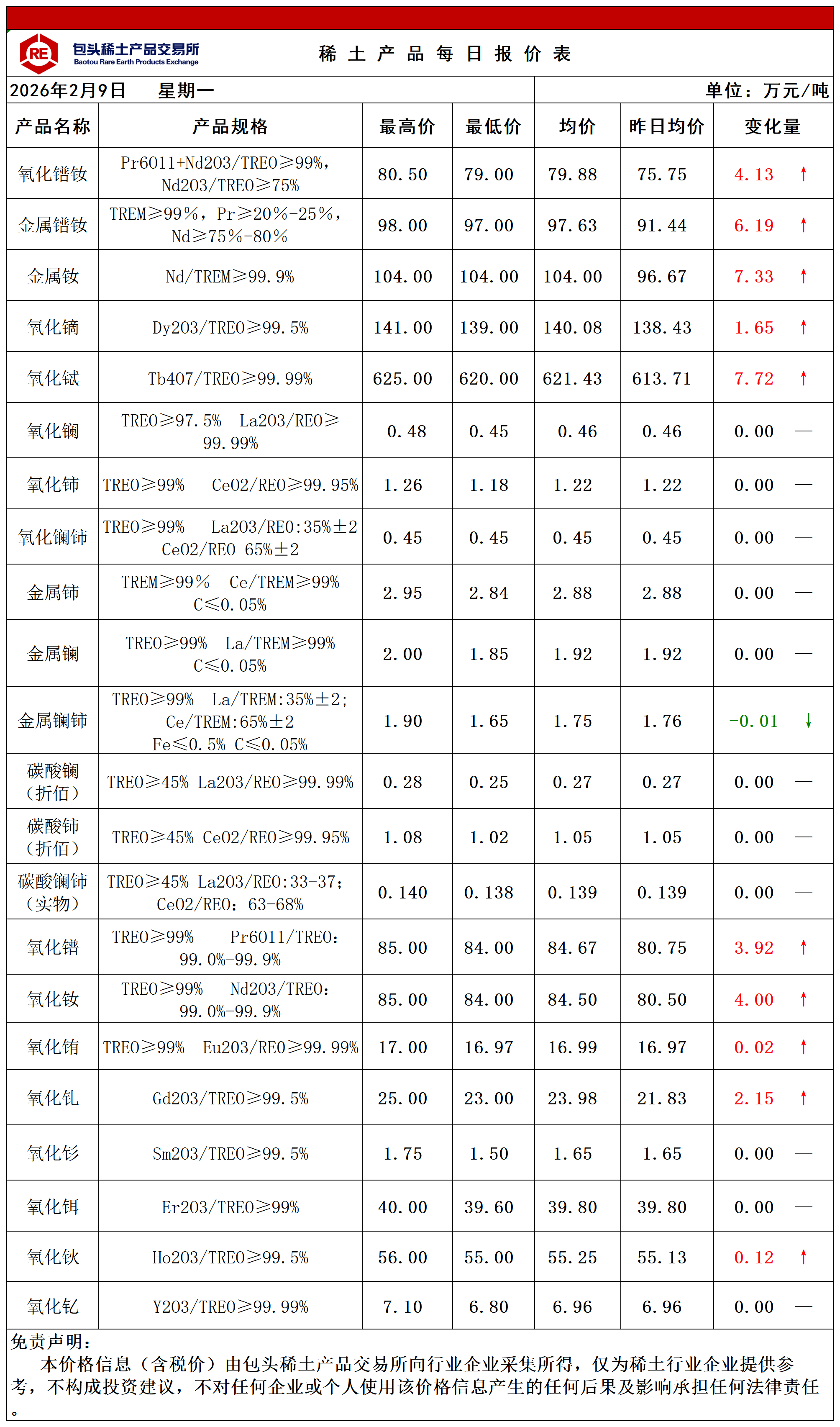 据“稀交所”2月9日消息,当日稀土主流产品价格整体上行。氧化镨钕均价79.88万元/吨,上涨4.13万元/吨;金属镨钕均价97.63万元/吨,上涨6.19万元/吨;氧化镝均价140.08万元/吨,上涨1.65万元/吨;氧化铽均价621.43万元/吨,上涨7.72万元/吨。今日询价氧化钕、氧化镨、氧化镧铈、氧化铕等产品成交信息较少,请慎重参考。