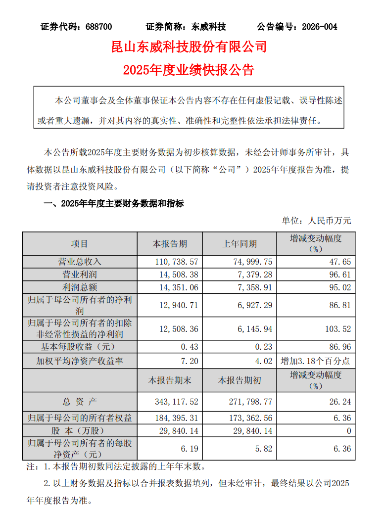 2月9日,东威科技(688700.SH)披露2025年年度业绩快报,全年营业总收入110,738.57万元,上年同期74,999.75万元,同比增长47.65%;利润总额14,351.06万元,上年同期7,358.91万元,同比增长95.02%;归属于上市公司股东的净利润12,940.71万元,上年同期6,927.29万元,同比增长86.81%;归属于上市公司股东的扣除非经常性损益的净利润12,508.36万元,上年同期6,145.94万元,同比增长103.52%;基本每股收益0.43元,上年同期0.23元,同比增长86.96%。