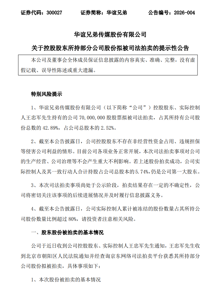 2月9日,华谊兄弟(300027.SZ)公告,公司控股股东、实际控制人王忠军所持公司7000万股股票拟被司法拍卖,占其所持股份比例42.89%,占公司总股本比例2.52%。本次司法拍卖事项尚处于公示阶段,拍卖结果存在不确定性。