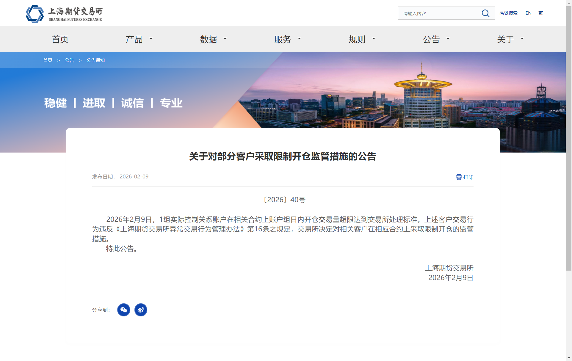 2月9日,上期所公告,2026年2月9日,1组实际控制关系账户在相关合约上账户组日内开仓交易量超限达到交易所处理标准。上述客户交易行为违反《上海期货交易所异常交易行为管理办法》第16条之规定,交易所决定对相关客户在相应合约上采取限制开仓的监管措施。