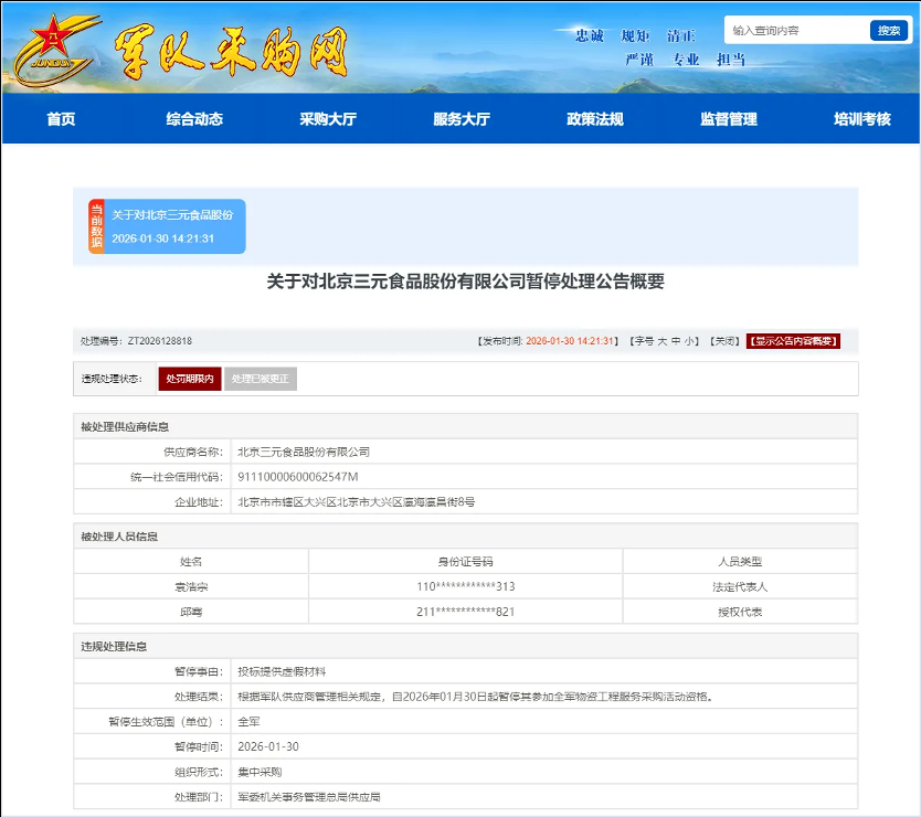 近日,军队采购网显示,知名乳企三元股份(北京三元食品股份有限公司)被暂停参加全军物资工程服务采购活动资格。根据公告信息,此次处理决定的直接事由为“投标提供虚假材料”。