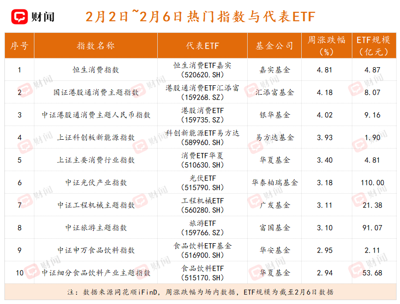 从ETF来看,港股消费类ETF表现出色,恒生消费ETF嘉实(520620.SH)、港股通消费ETF汇添富(159268.SZ)以及港股消费ETF(159735.SZ)的涨幅均超过4%。在A股方面,食品饮料ETF基金(516900.SH)和食品饮料ETF(515170.SH)也分别录得2.95%和2.94%的周涨幅。