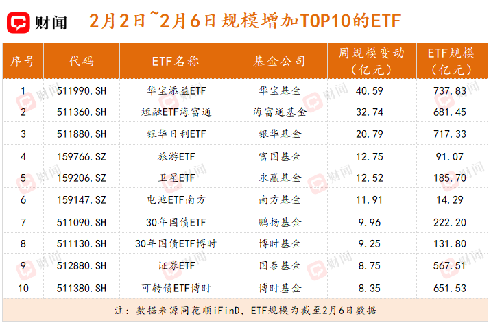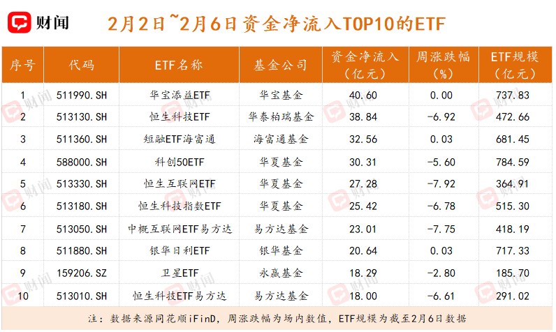 在2月市场波动加剧的背景下,资金行为呈现出明显的防御性特征。上周,资金在积极布局恒生科技板块的同时,也显著加码货币型ETF,华宝添益ETF(511990.SH)和银华日利ETF(511880.SH)单周规模分别增长40.59亿元和20.79亿元,分别达到737.83亿元和717.33亿元,一定程度上反映出资金“持币过节”的意愿。