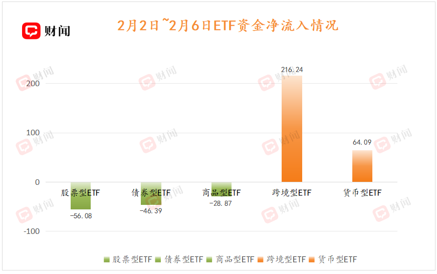 临近春节,跨境型ETF和货币型ETF更受资金青睐,上周分别获得216.24亿元和64.09亿元的净流入。而股票型、债券型和商品型ETF则呈现资金净流出的态势。