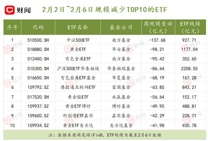 与之相对应的是,宽基ETF和黄金ETF的规模在大幅减少。其中,上周规模下滑最大的是中证500ETF(510500.SH),规模单周蒸发137.68亿元,规模降至927.71亿元,暂别“千亿俱乐部”。上周,华安基金的黄金ETF(518880.SH)也出现了98.21亿元的规模缩水。