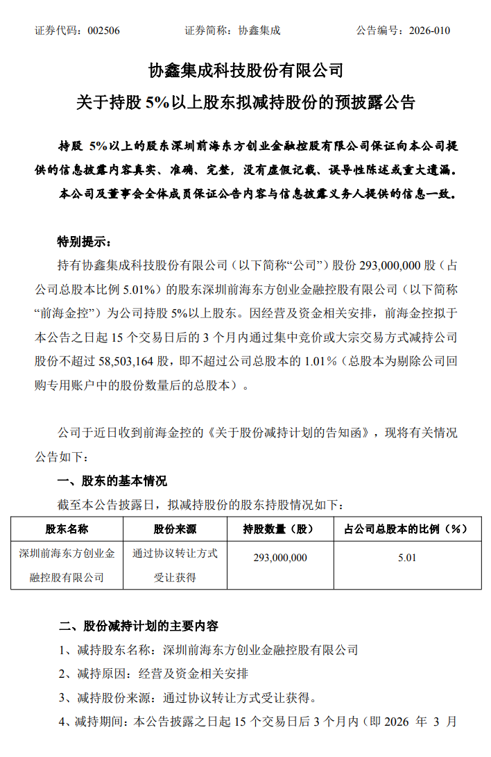 2月9日,协鑫集成(002506.SZ)发布公告。持股5%以上股东深圳前海东方创业金融控股有限公司因经营及资金相关安排,拟于公告披露之日起15个交易日后的3个月内(即2026年3月12日至2026年6月11日),通过集中竞价或大宗交易方式减持公司股份不超过5850.32万股,占公司总股本的1.01%。股份来源为协议转让方式受让获得。