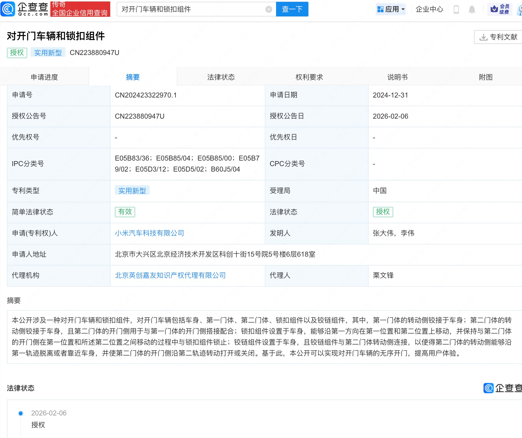 企查查APP显示,近日,小米汽车科技有限公司申请的“对开门车辆和锁扣组件”专利获授权。企查查专利摘要显示,本公开的对开门车辆包括车身、第一门体、第二门体、锁扣组件以及铰链组件,其中,第一门体的转动侧铰接于车身;第二门体的转动侧铰接于车身,且第二门体的开门侧用于与第一门体的开门侧搭接配合;锁扣组件设置于车身,能够沿第一方向在第一位置和第二位置上移动,并保持与第二门体的开门侧在第一位置和所述第二位置之间移动的过程中与锁扣组件锁止;铰链组件设置于车身,且铰链组件与第二门体转动侧连接,以使得第二门体的转动侧能够沿第一轨迹脱离或者靠近车身,并使第二门体的开门侧沿第二轨迹转动打开或关闭。基于此,本公开可以实现对开门车辆的无序开门,提高用户体验。