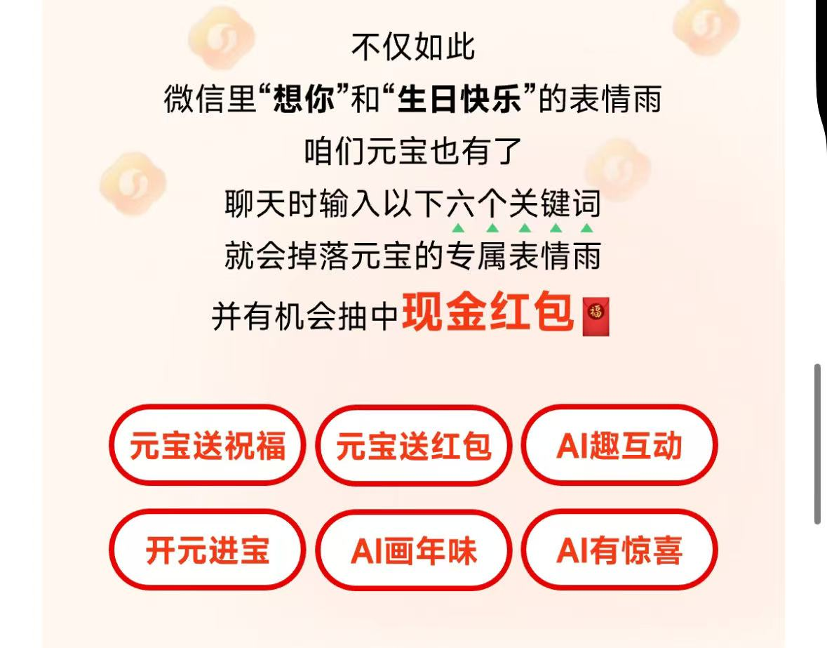 2月10日,据腾讯消息,元宝又出新玩法,2月10日至2月23日,通过“元宝创建派、@元宝互动、和派友聊天一起听一起看”等方式,均有机会触发拼手气现金红包。另外,微信里聊天时输入六个关键词“元宝送祝福、开元进宝、元宝送红包”等就会掉落元宝的专属表情雨并有机会抽中现金红包。