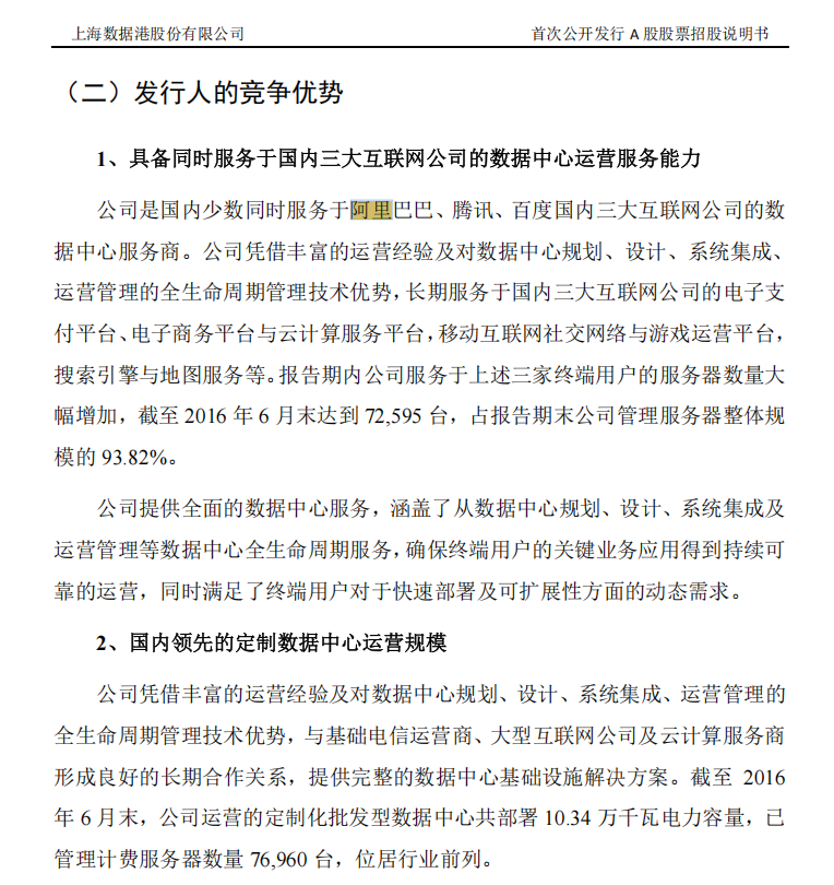 2017年,数据港招股说明书显示,公司是国内少数同时服务于阿里巴巴、腾讯、百度国内三大互联网公司的数据中心服务商。