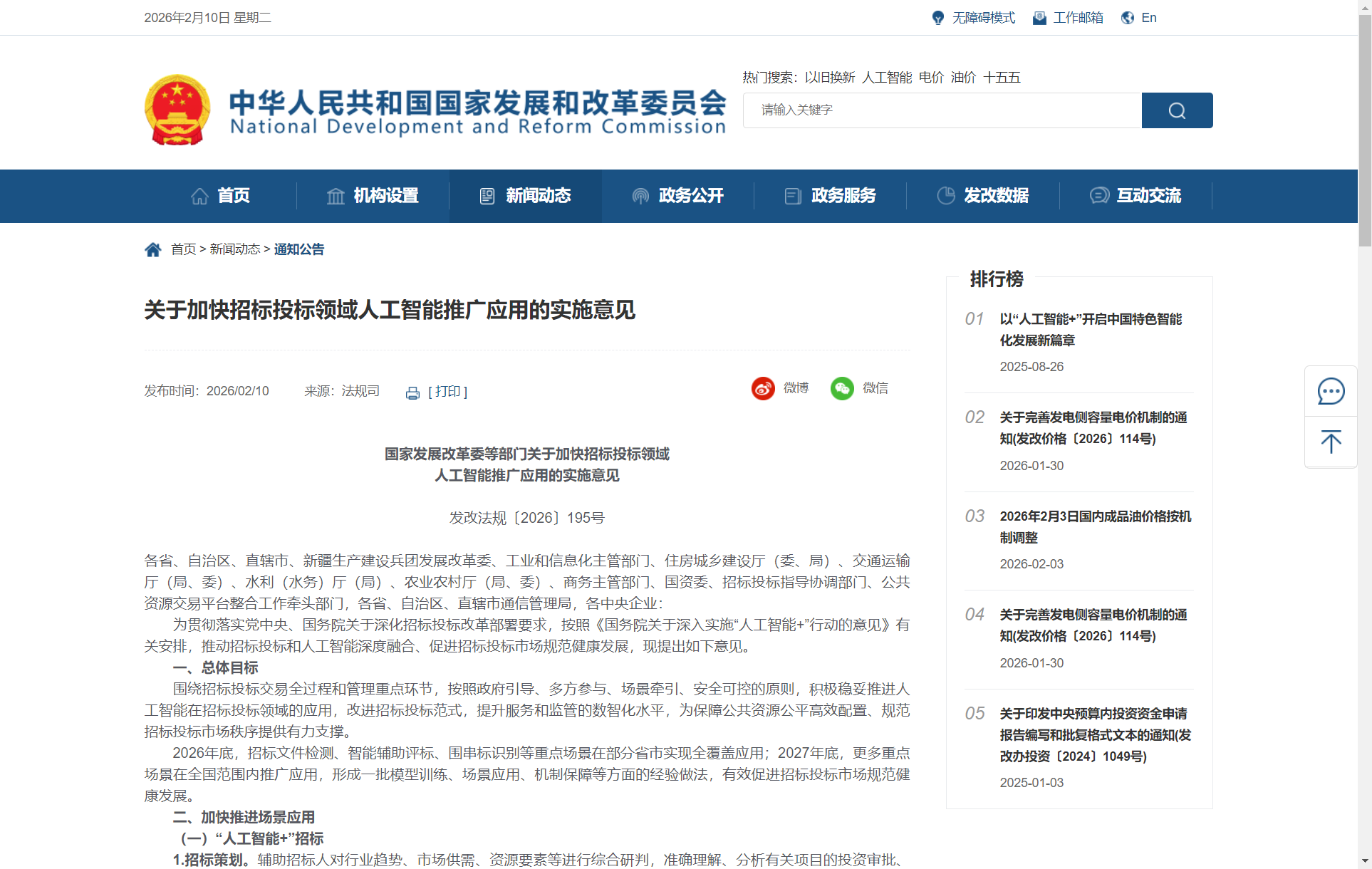 2月10日,国家发展改革委等部门发布加快招标投标领域人工智能推广应用的实施意见。其中提出,围绕招标投标交易全过程和管理重点环节,按照政府引导、多方参与、场景牵引、安全可控的原则,积极稳妥推进人工智能在招标投标领域的应用,改进招标投标范式,提升服务和监管的数智化水平,为保障公共资源公平高效配置、规范招标投标市场秩序提供有力支撑。2026年底,招标文件检测、智能辅助评标、围串标识别等重点场景在部分省市实现全覆盖应用;2027年底,更多重点场景在全国范围内推广应用,形成一批模型训练、场景应用、机制保障等方面的经验做法,有效促进招标投标市场规范健康发展。