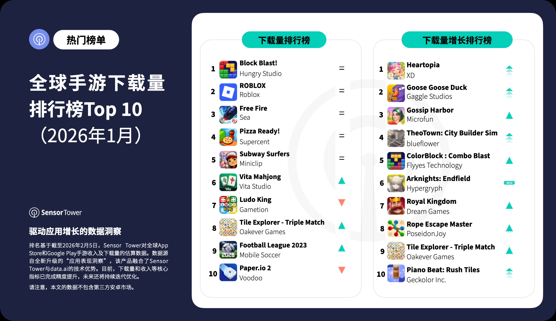 2月11日,Sensor Tower发布2026年1月全球手游收入与下载量排行榜TOP10。《Block Blast!》在2026年1月稳居全球手游下载量榜首,延续了其上一周期的领先地位。《ROBLOX》表现稳定,位列第2;紧随其后的是《Free Fire》、《Pizza Ready!》和《Subway Surfers》,共同构成了下载榜的前五强。
