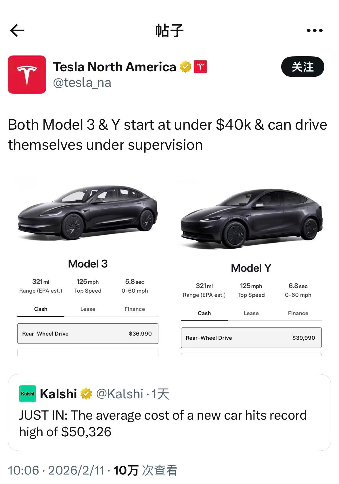 2月11日,特斯拉(TSLA.US)北美官网转发该帖子表示,Model 3和 Model Y的起售价均低于4万美元,并且在有人监督的情况下能够实现自动驾驶。
