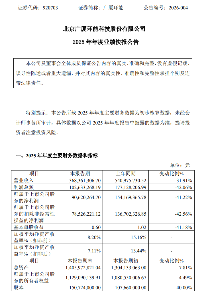 2月11日,广厦环能(920703.BJ)披露2025年年度业绩快报,全年营业收入为3.68亿元,上年同期为5.41亿元,同比下降31.91%;利润总额为1.03亿元,上年同期为1.77亿元,同比下降42.06%;归属于上市公司股东的净利润为0.91亿元,上年同期为1.54亿元,同比下降41.22%;归属于上市公司股东的扣除非经常性损益的净利润为0.79亿元,上年同期为1.37亿元,同比下降42.56%;基本每股收益为0.60元,上年同期为1.02元,同比下降41.18%。