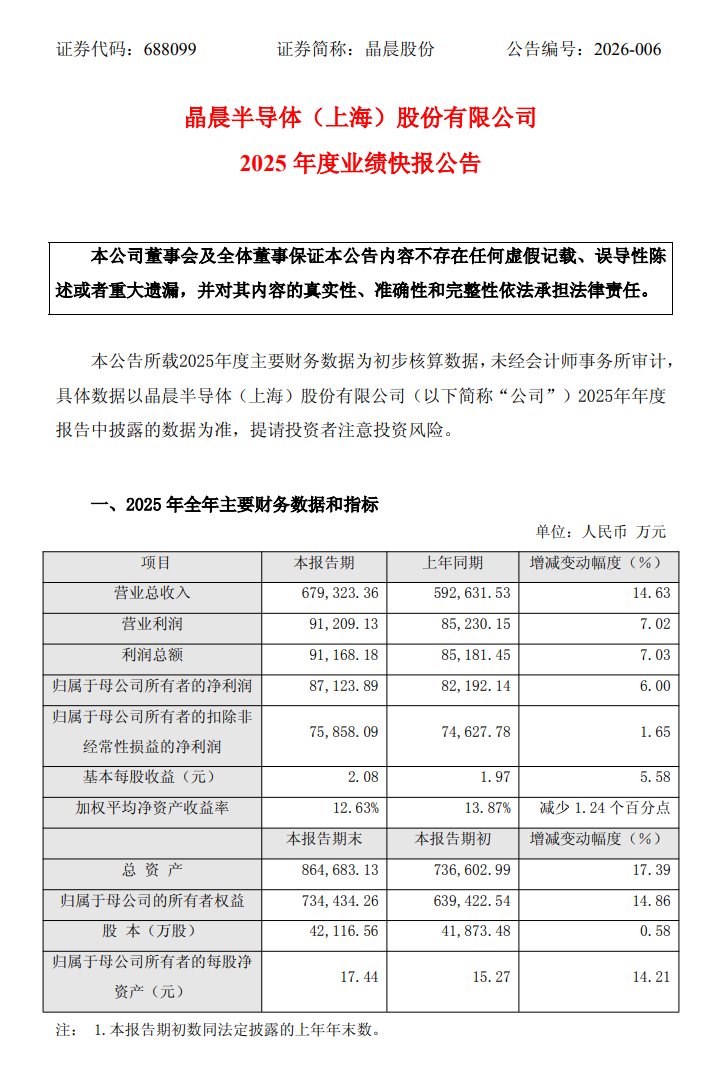 2月11日,晶晨股份(688099.SH)披露2025年年度业绩快报,全年营业收入67.93亿元,上年同期59.26亿元,同比增长14.63%;利润总额9.12亿元,上年同期8.52亿元,同比增长7.03%;归属于上市公司股东的净利润8.71亿元,上年同期8.22亿元,同比增长6.00%;归属于上市公司股东的扣除非经常性损益的净利润7.59亿元,上年同期7.46亿元,同比增长1.65%;基本每股收益2.08元,上年同期1.97元,同比增长5.58%。