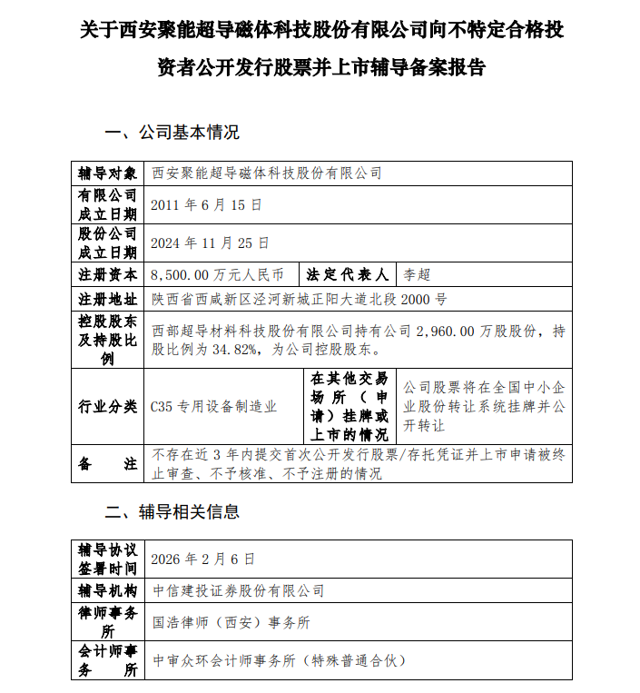 2月12日,证监会网站披露,西安聚能超导磁体科技股份有限公司于2026年2月11日在陕西证监局办理辅导备案登记,拟向不特定合格投资者公开发行股票并上市,辅导机构为中信建投证券。