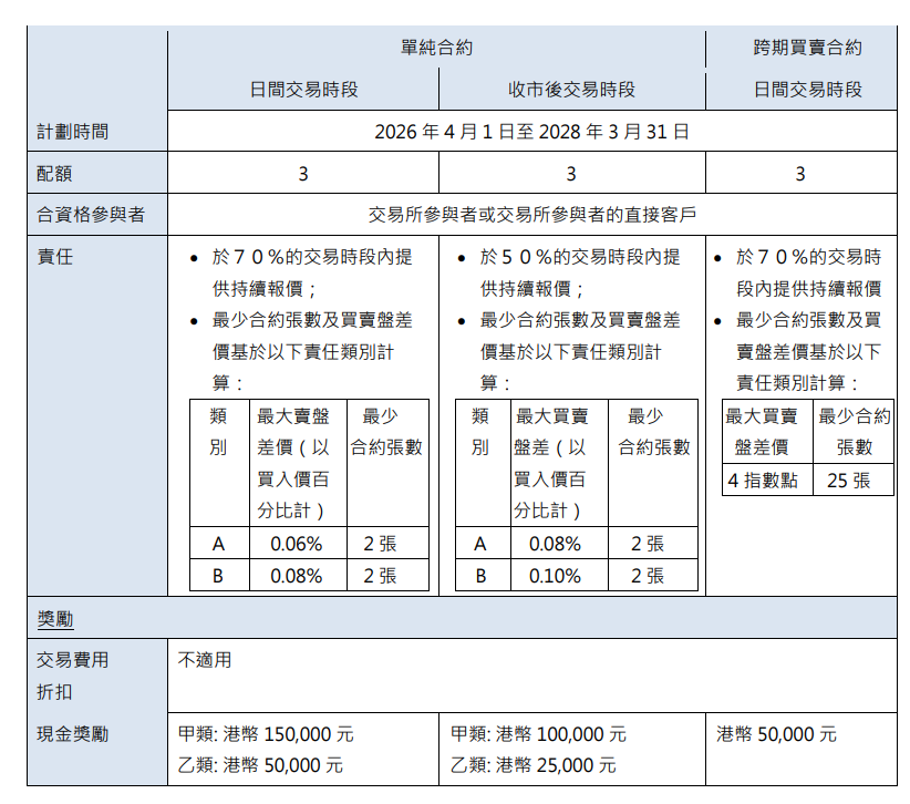 交易所将于2026年4月1日至2028年3月31日期间推出下一期的MSCI中国A50期货流通量提供者计划及活跃交易者计划。
