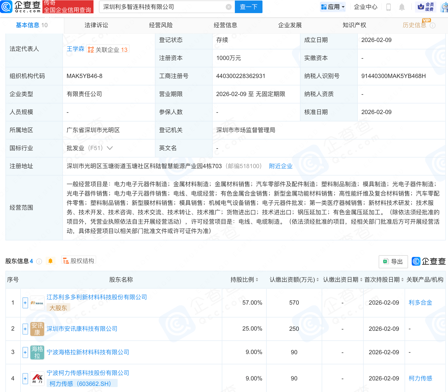 企查查APP显示,近日,深圳利多智连科技有限公司成立,注册资本1000万元,经营范围包含:有色金属合金销售;新型金属功能材料销售;高性能纤维及复合材料销售;汽车零配件零售等。企查查股权穿透显示,该公司由柯力传感(603662.SH)等共同持股。