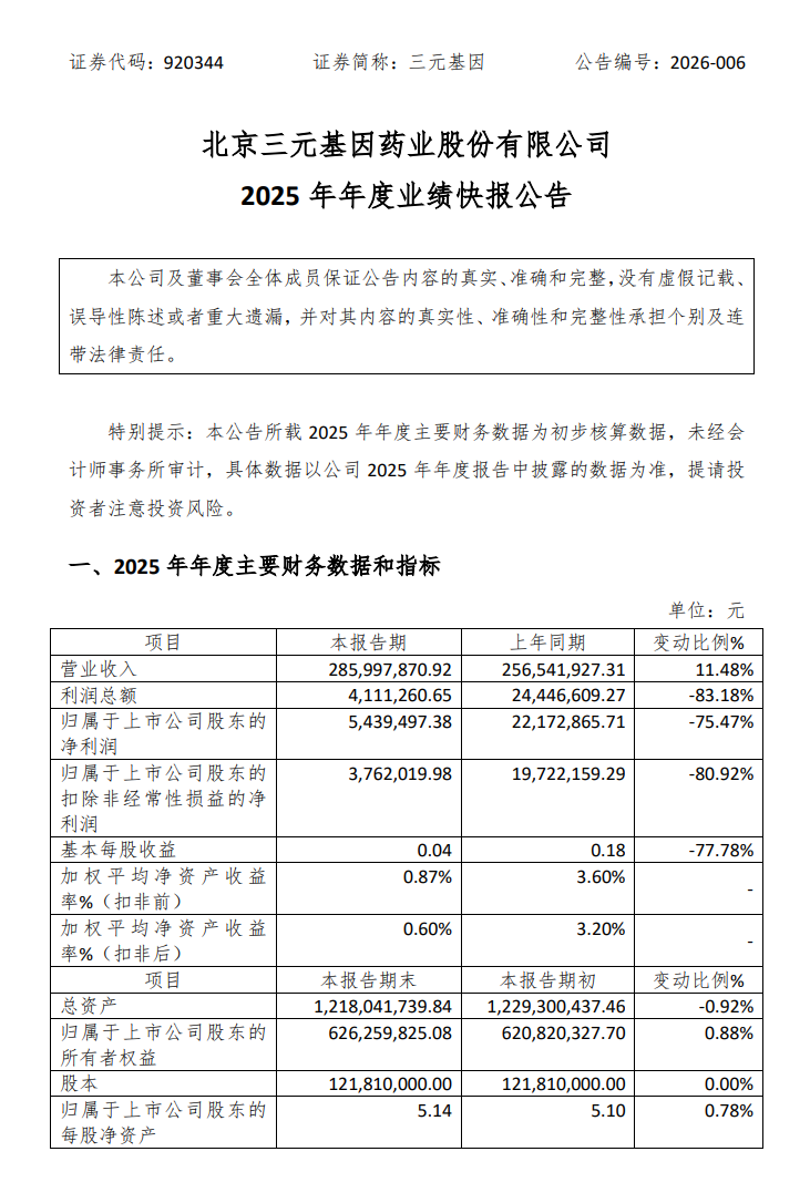 2月12日,三元基因(920344.BJ)披露2025年年度业绩快报,全年营业收入2.86亿元,上年同期2.57亿元,同比增长11.48%;利润总额411.13万元,上年同期2444.66万元,同比下降83.18%;归属于上市公司股东的净利润543.95万元,上年同期2217.29万元,同比下降75.47%;归属于上市公司股东的扣除非经常性损益的净利润376.20万元,上年同期1972.22万元,同比下降80.92%;基本每股收益0.04元,上年同期0.18元,同比下降77.78%。