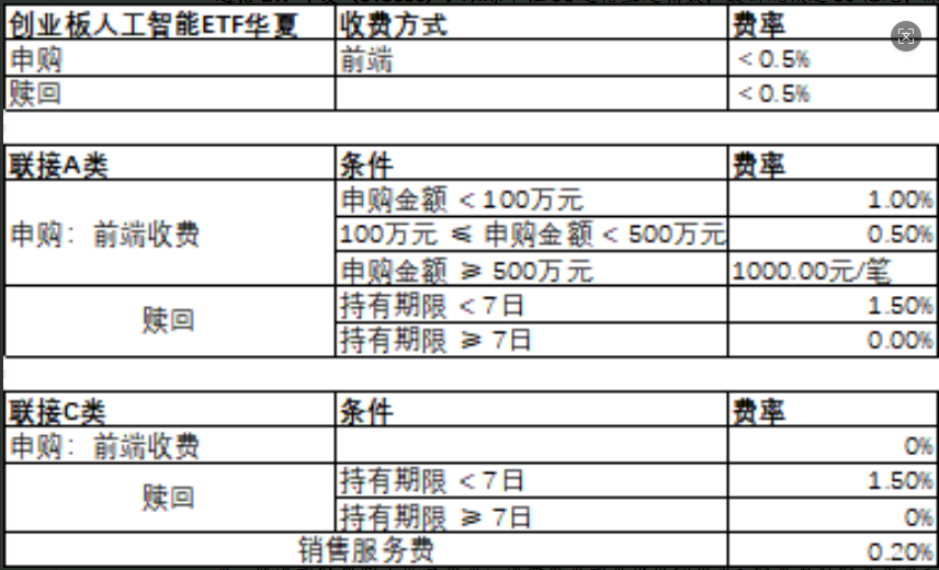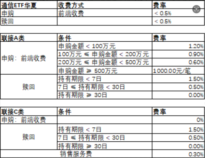 注:以上所提及ETF均不收取申购费、赎回费、销售服务费,申购赎回代理机构可按照不超过0.5%的标准收取佣金,其中包含证券交易所、登记结算机构等收取的相关费用;此外,相关ETF及联接的管理费率和托管费率如下所示: