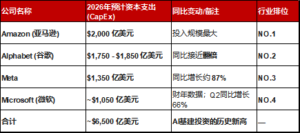 为了在这场决定未来数十年格局的军备竞赛中不掉队,四家公司2026年的资本支出(CapEx)总额预计将高达6500亿美元。这种“不惜代价”的投入规模,充分印证全球AI算力需求仍处于高速增长阶段。