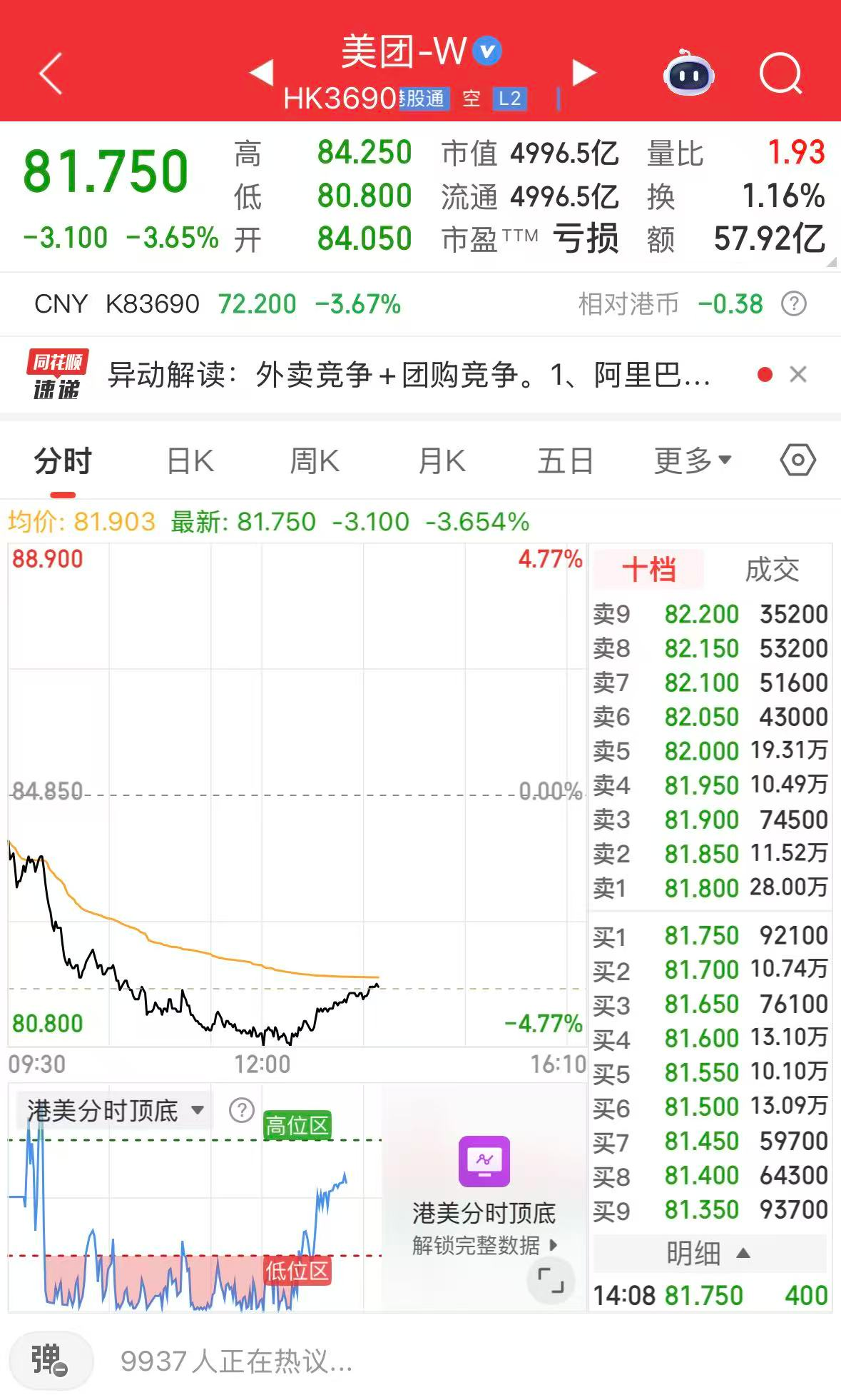 2月13日,美团-W(03690.HK)股价持续下跌,盘中跌幅超过4.5%。截止发稿,美团市值为4996.5亿港元,跌破5000亿港元,报81.75港元/股。