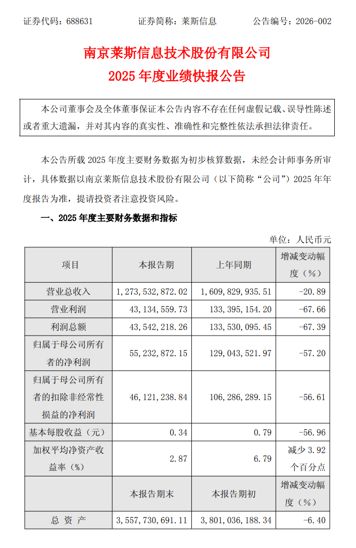 2月13日,莱斯信息(688631.SH)披露2025年度业绩快报,全年营业收入12.74亿元,上年同期为16.10亿元,同比下降20.89%;利润总额0.44亿元,上年同期为1.34亿元,同比下降67.39%;归属于上市公司股东的净利润0.55亿元,上年同期为1.29亿元,同比下降57.20%;归属于上市公司股东的扣除非经常性损益的净利润0.46亿元,上年同期为1.06亿元,同比下降56.61%;基本每股收益0.34元,上年同期为0.79元,同比下降56.96%。