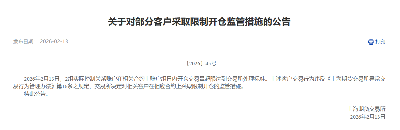 2月13日,上海期货交易所发布关于对部分客户采取限制开仓监管措施的公告:2026年2月13日,2组实际控制关系账户在相关合约上账户组日内开仓交易量超限达到交易所处理标准。上述客户交易行为违反《上海期货交易所异常交易行为管理办法》第16条之规定,交易所决定对相关客户在相应合约上采取限制开仓的监管措施。
