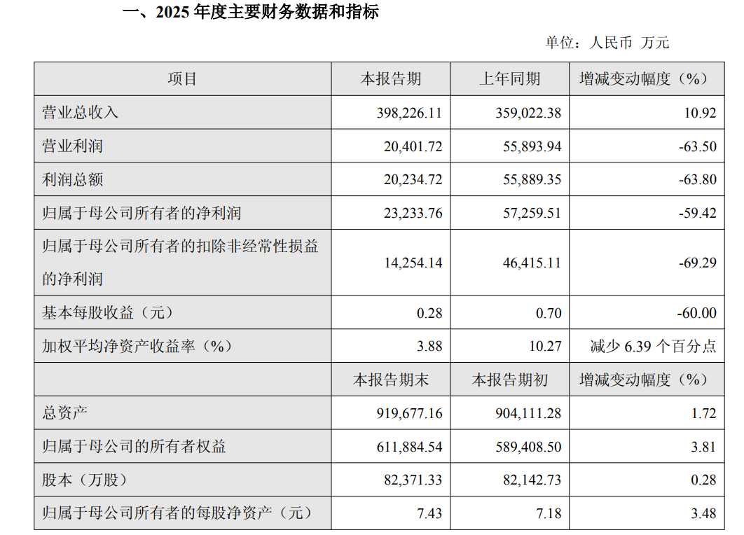 全年营业收入39.82亿元,同比增长10.92%;归属于上市公司股东的净利润2.32亿元,同比下降59.42%。