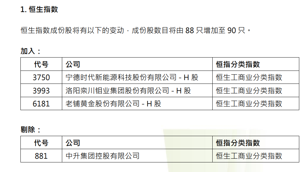 2月13日,恒生指数公司宣布,恒生指数成份股数目将由88只增加至90只。新加入宁德时代(300750.SZ)、洛阳钼业(603993.SH)和老铺黄金(06181.HK),剔除中升集团控股有限公司。