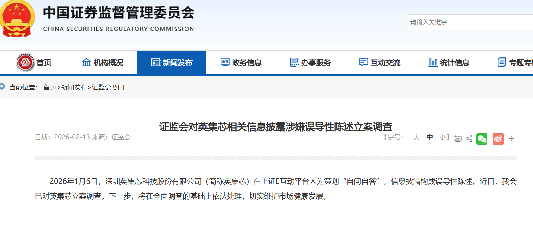 据证监会官网2月13日消息,2026年1月6日,英集芯(688209.SH)在上证E互动平台人为策划“自问自答”,信息披露构成误导性陈述。近日,我会已对英集芯立案调查。下一步,将在全面调查的基础上依法处理,切实维护市场健康发展。
