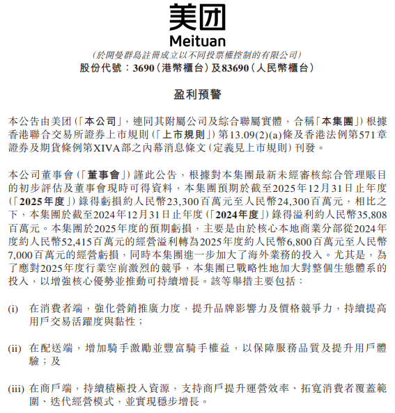 2月13日,美团-W(03690.HK)公告,根据对本集团最新未经审核综合管理账目的初步评估及董事会现时可得资料,本集团预期于截至2025年12月31日止年度录得亏损约人民币233亿元至人民币243亿元,相比之下,本集团于截至2024年12月31日止年度录得溢利约人民币358.08亿元。本集团于2025年度的预期亏损,主要是由于核心本地商业分部从2024年度约人民币524.15亿元的经营溢利转为2025年度约人民币68亿元至人民币70亿元的经营亏损,同时本集团进一步加大了海外业务的投入。尤其是,为了应对2025年度行业空前激烈的竞争,本集团已战略性地加大对整个生态体系的投入,以增强核心优势并推动可持续增长。