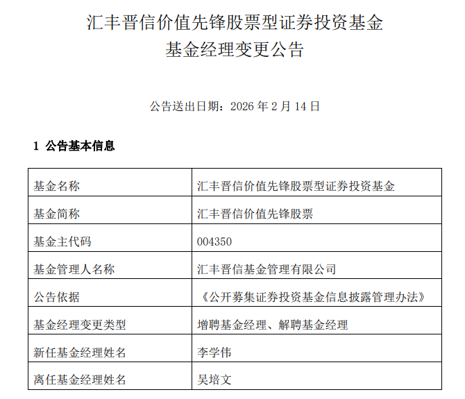 汇丰晋信基金14日发布公告,宣布旗下汇丰晋信价值先锋股票型证券投资基金A(基金代码:004350)发生基金经理变更。原基金经理吴培文因工作调整离任,新任基金经理李学伟自2026年2月14日起正式接管该基金。