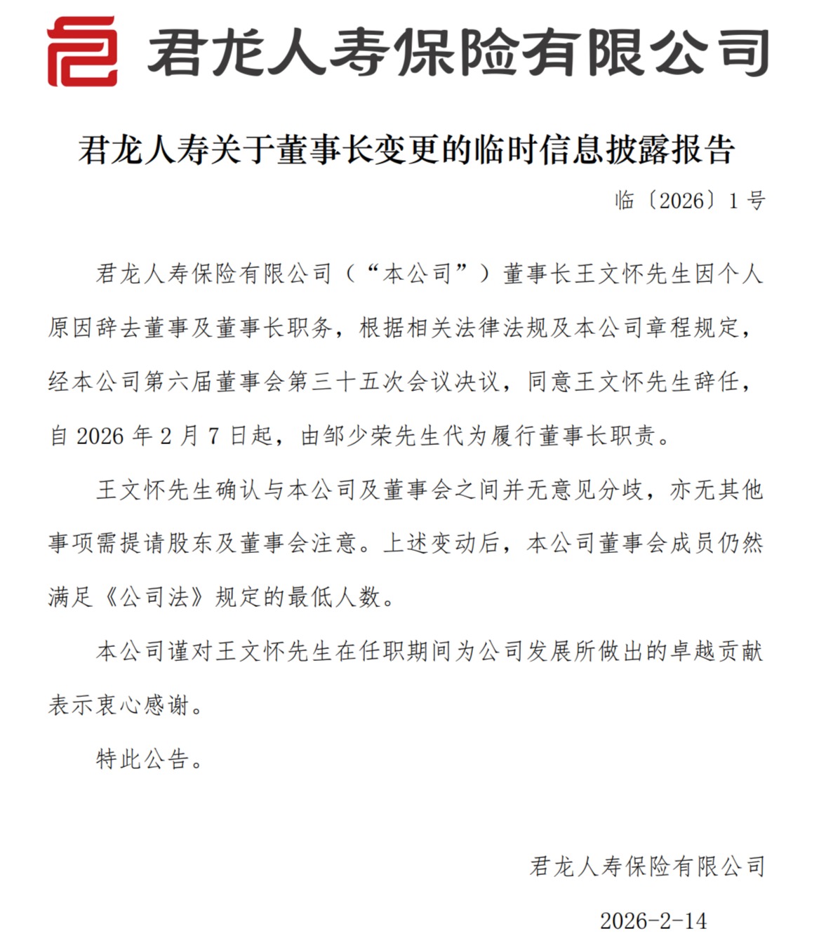 2月14日,君龙人寿保险有限公司发布公告称,公司董事长王文怀因个人原因辞去董事及董事长职务,根据相关法律法规及公司章程规定,经公司第六届董事会第三十五次会议决议,同意王文怀辞任,自2026年2月7日起,由邹少荣代为履行董事长职责。