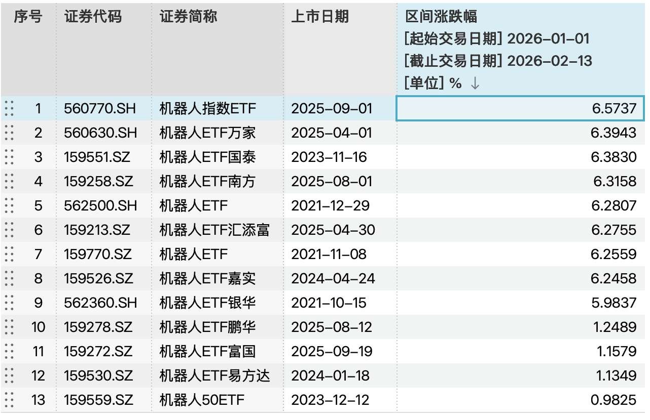 据统计,全市场共计13只机器人ETF。截至2月13日(春节前最后一个交易日),2026开年以来,机器人ETF悉数实现上涨。其中,跟踪中证机器人指数的机器人指数ETF(560770.SH)涨幅为6.57%,暂居榜首。