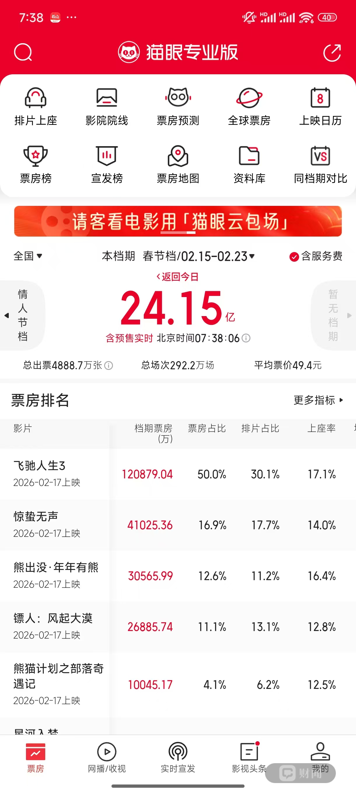 2026春节档票房破24亿 《飞驰人生3》档期票房破12亿