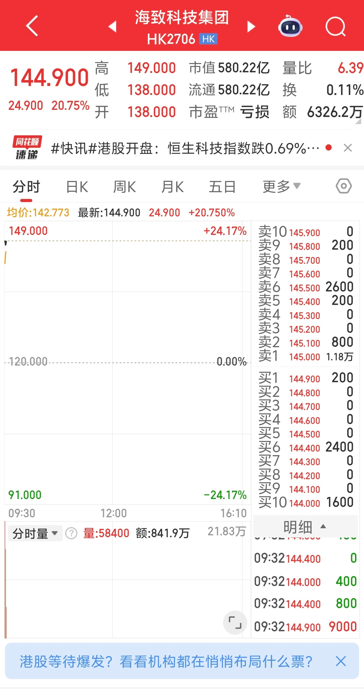2月20日,港股开盘,海致科技集团(02706.HK)涨超20%、MINIMAX-WP(00100.HK)涨超11%、智谱(02513.HK)涨超16%。