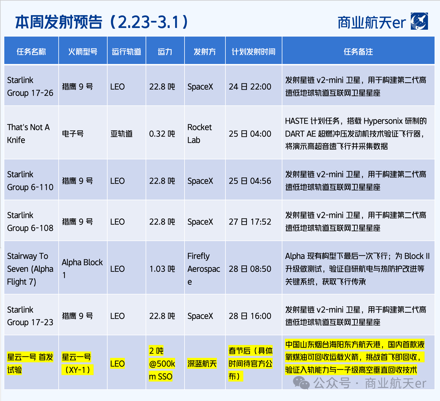 根据公众号“商业航天er”统计,本周(2.23日至3月1日),本周全球有七次卫星发射,其中马斯克旗下SpaceX的猎鹰9号将发射四次,总发射吨数达到91.2吨,其他三次分别是美国商业航天公司火箭实验室(Rocket Lab)、萤火虫太空公司(Firefly Aerospace)和中国民营航天公司深蓝航天所进行的发射。后三家发射吨位较轻,分别是0.32吨、1.03吨和2吨。