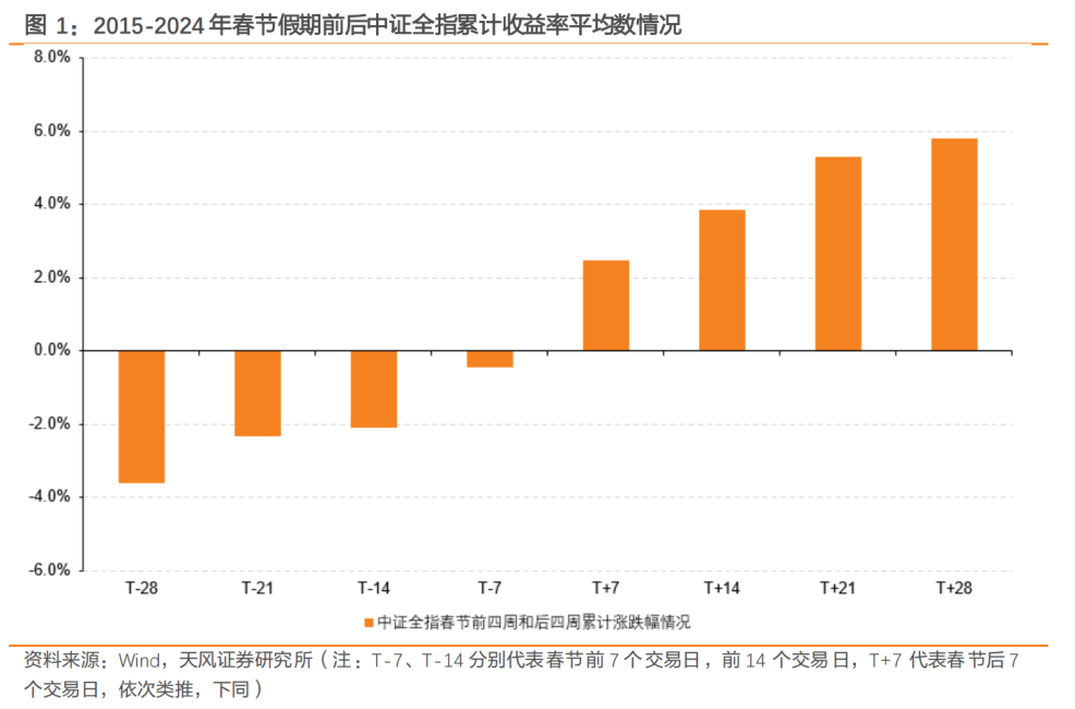 从春节到两会期间,市场有极大概率上涨,这就是所谓的“红包行情”,或者说“春季行情”。天风证券指出,节后表现往往强于节前,节前阶段呈现越临近春节、跌幅越收敛的特征,春节后市场整体胜率较高。
